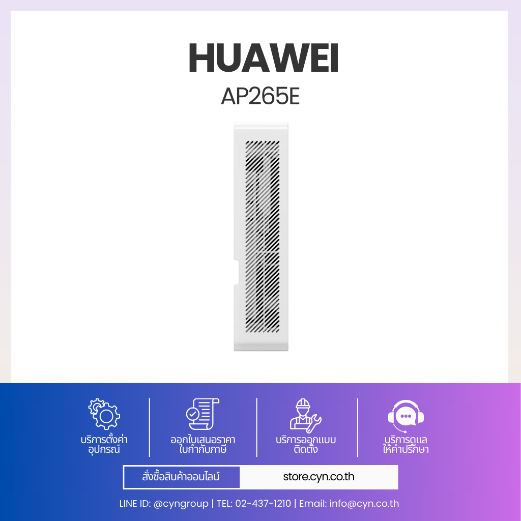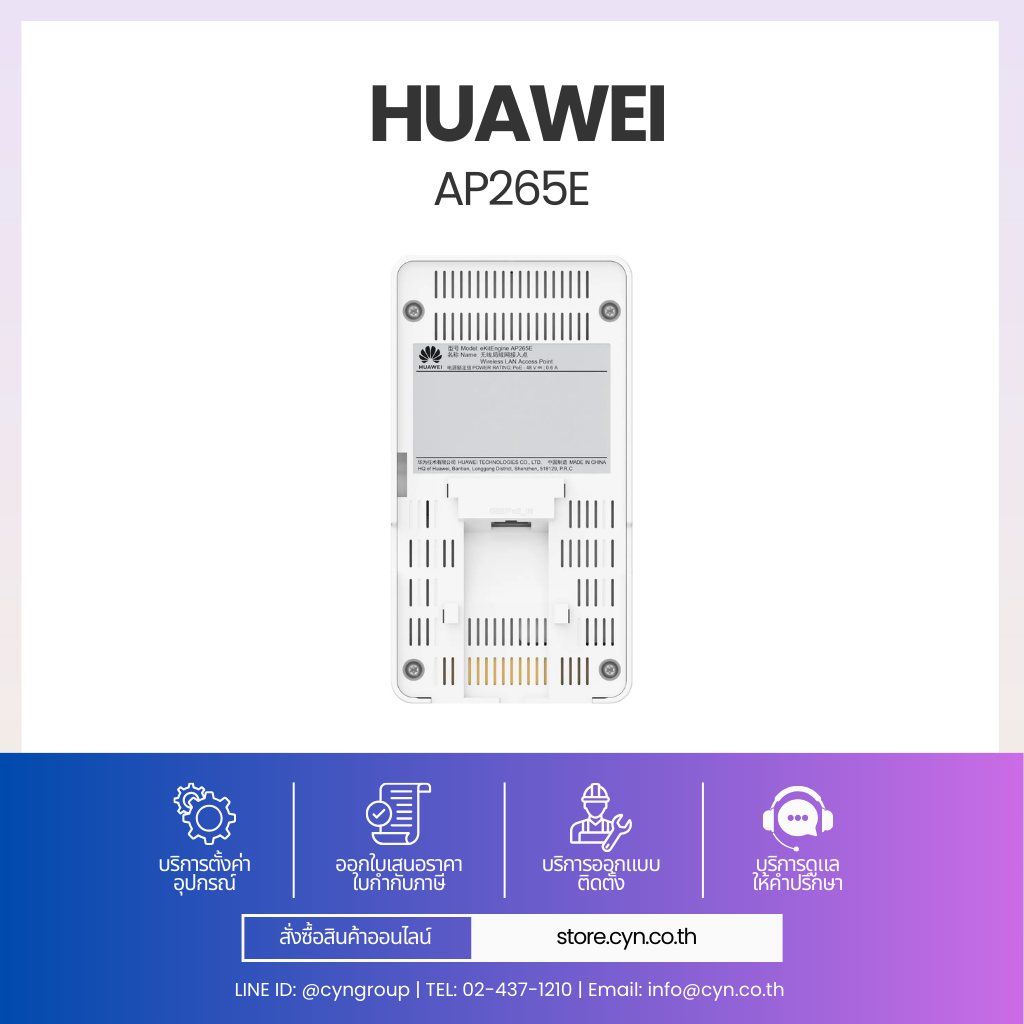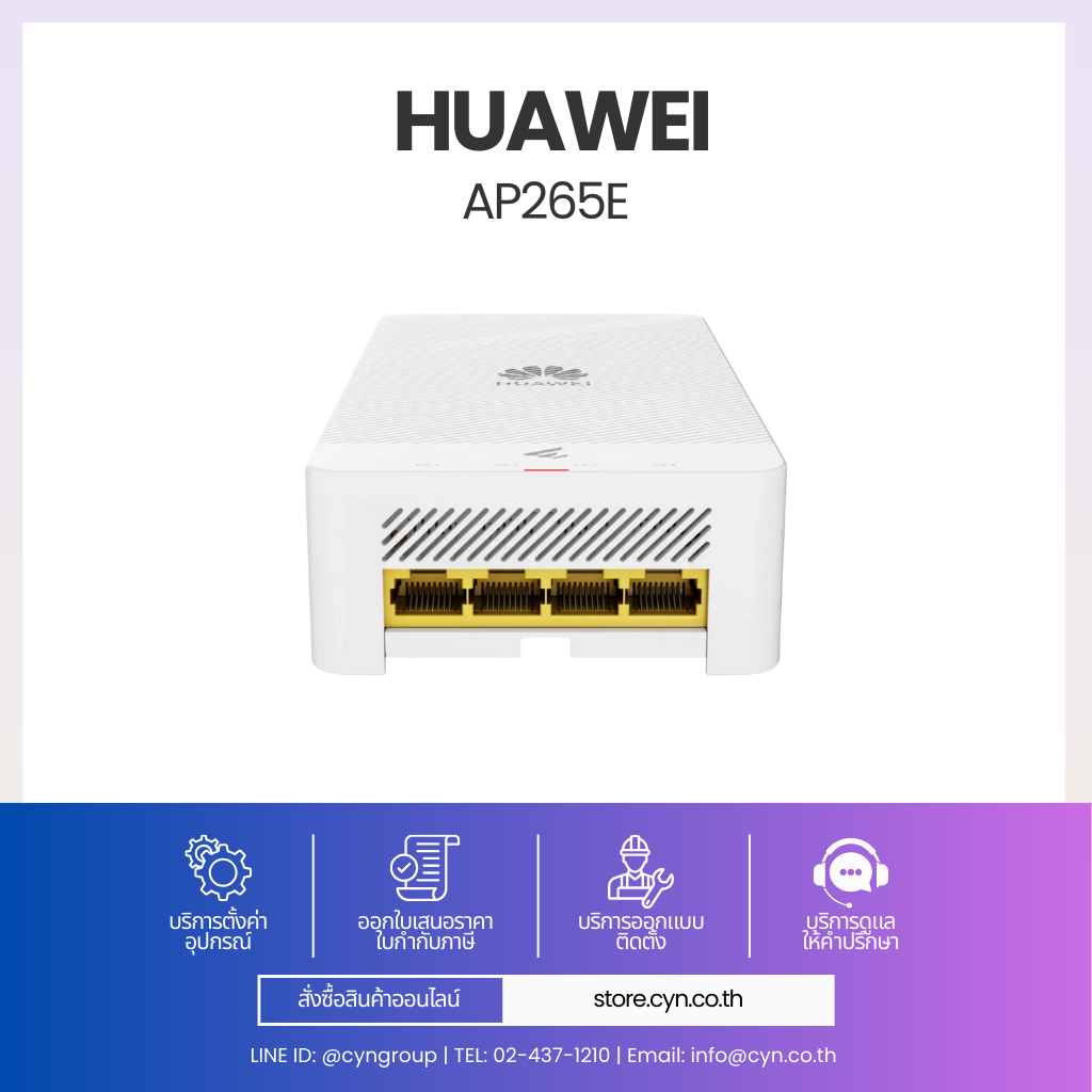 Huawei eKitEngine AP265E เป็น Indoor Wall Plate Access Point ที่ออกแบบมาเพื่องานติดตั้งในห้องพักหรือพื้นที่ส่วนบุคคลโดยเฉพาะ รองรับมาตรฐาน Wi-Fi 6 (802.11ax) ให้บริการพร้อมกันบนย่าน 2.4 GHz (2×2 MIMO) และ 5 GHz (2×2 MIMO) รวมสูงสุด 4 Spatial Streams ความเร็วรวมสูงสุด 2.975 Gbps