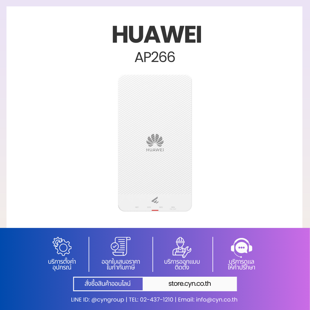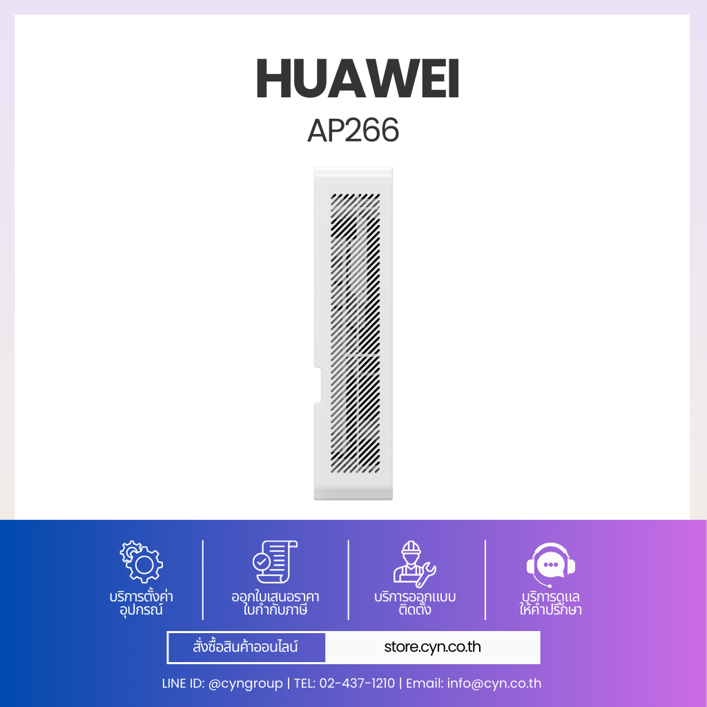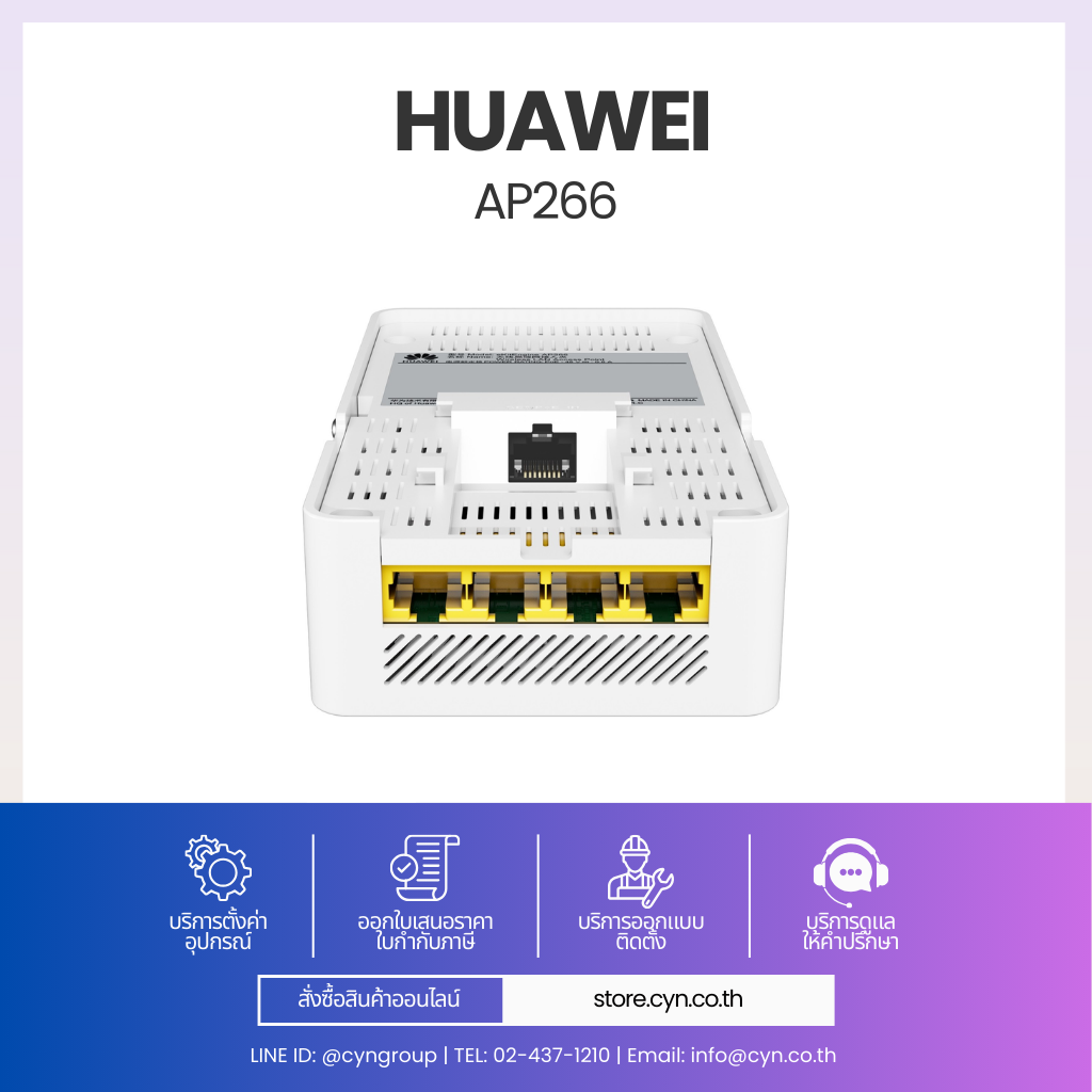 Huawei eKitEngine AP266 เป็น Indoor Slim Wall Plate Access Point ที่ออกแบบมาเพื่อติดตั้งแทนเต้ารับ LAN ภายในห้อง รองรับมาตรฐาน Wi-Fi 6 (802.11ax) ให้บริการพร้อมกันบนย่าน 2.4 GHz (2×2 MIMO) และ 5 GHz (2×2 MIMO) รวม 4 Spatial Streams ให้ความเร็วรวมสูงสุด 2.975 Gbps