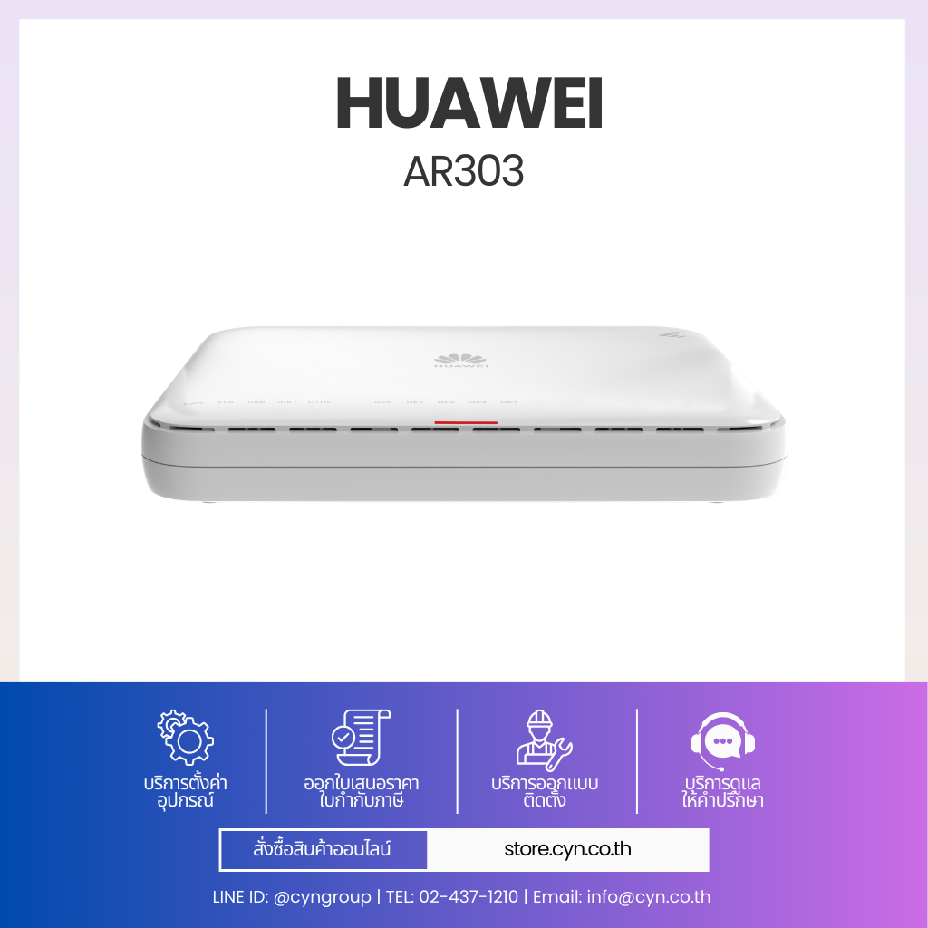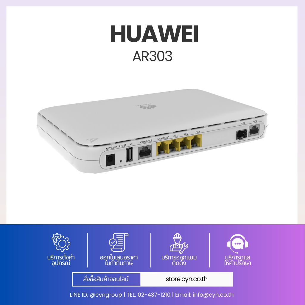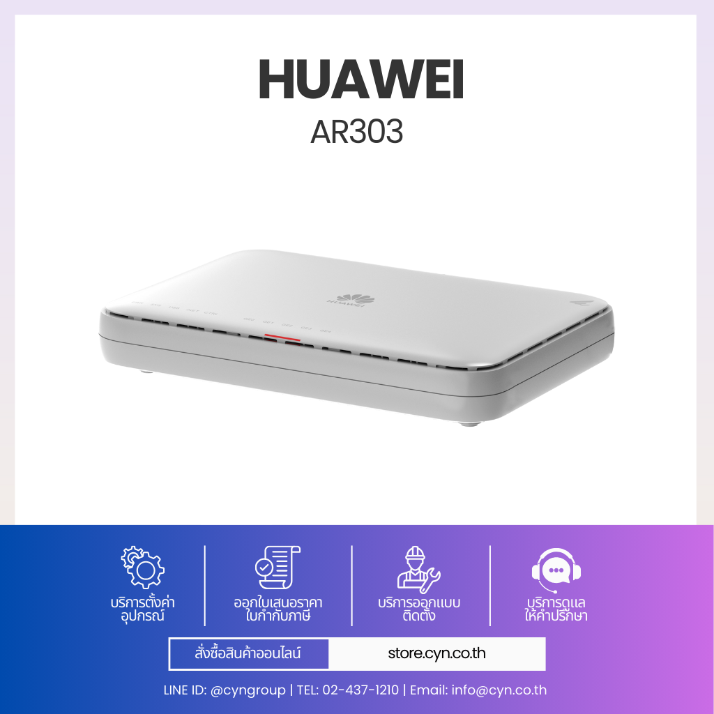 Huawei AR303 เป็นเราเตอร์รุ่นใหม่สำหรับธุรกิจขนาดเล็กและกลาง ออกแบบมาเพื่อทำให้เครือข่าย ง่ายขึ้นและฉลาดขึ้น ตัวเครื่องใช้ Dual-Core Processor แยก Data Plane และ Control Plane ช่วยเพิ่มประสิทธิภาพการประมวลผลบริการต่าง ๆ ได้พร้อมกัน