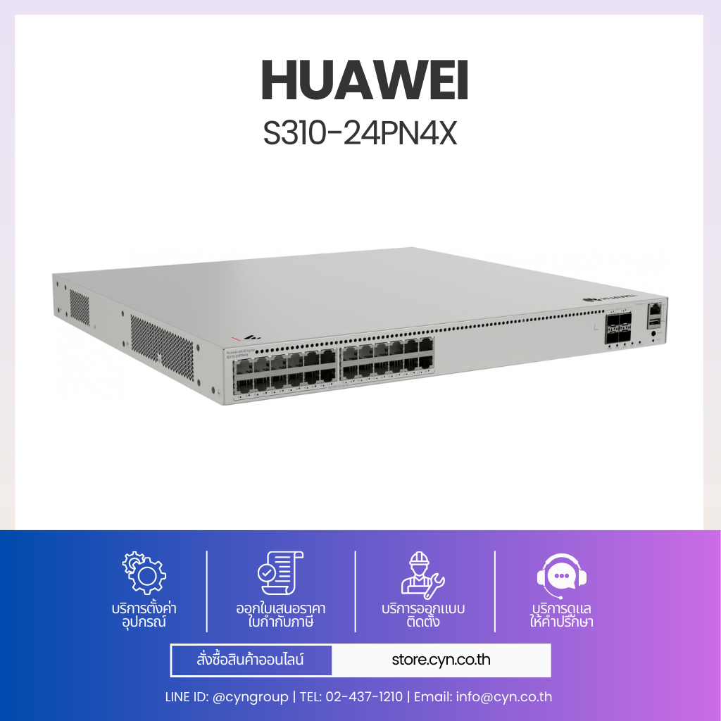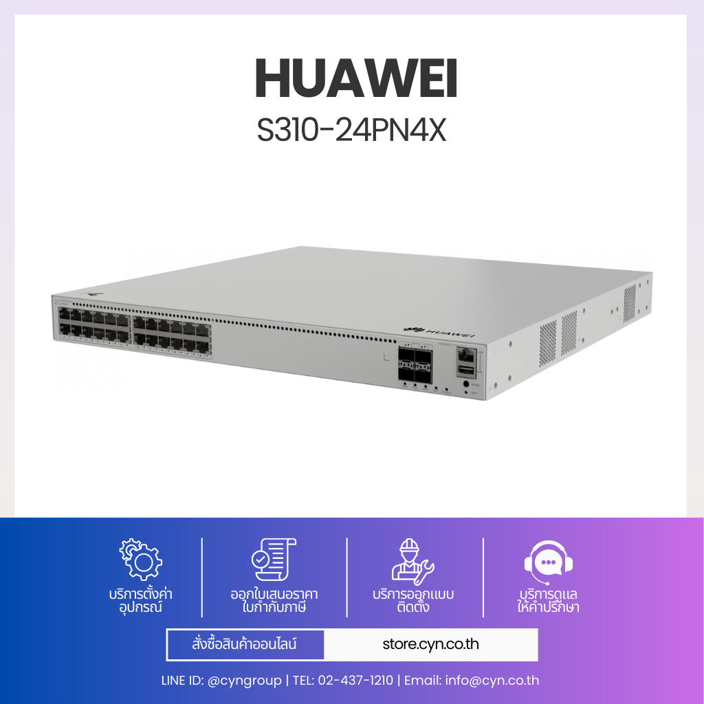 Huawei eKitEngine S310-24PN4X เป็น L2+ Managed Switch ที่ออกแบบมาสำหรับระบบเครือข่ายที่ต้องการทั้ง “ความเร็ว” และ “พลังงาน” ในเครื่องเดียว ตัวเครื่องมาพร้อมพอร์ต 10/100/1000/2.5GBASE-T จำนวน 24 พอร์ต รองรับ PoE+ กำลังไฟรวมสูงสุด 400W เหมาะอย่างยิ่งสำหรับ Access Point Wi-Fi 6/6E, กล้อง IP ความละเอียดสูง และอุปกรณ์ IoT