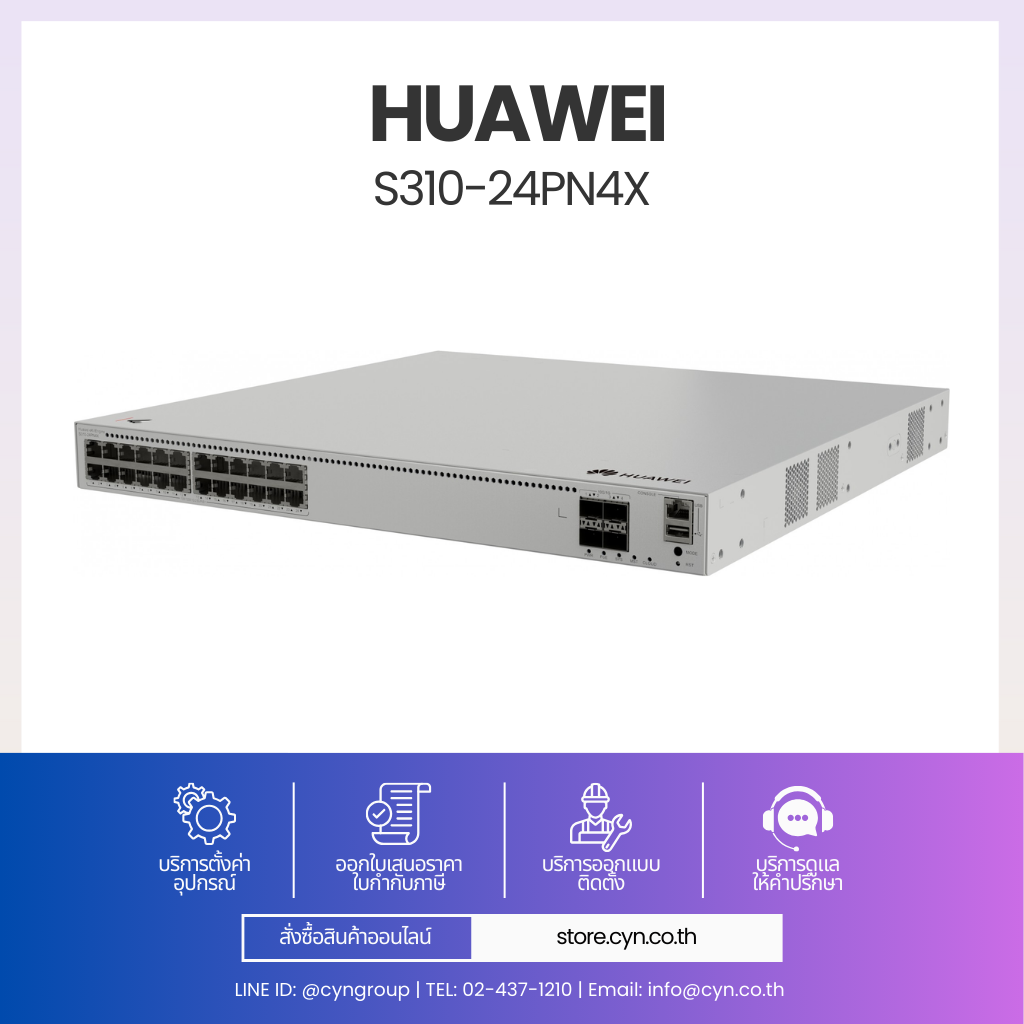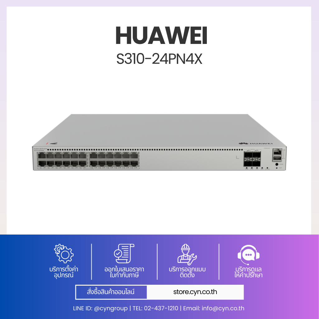 Huawei eKitEngine S310-24PN4X เป็นสวิตช์ประสิทธิภาพสูงในตระกูล S310 ที่ออกแบบมาเพื่อรองรับเครือข่ายยุคใหม่โดยเฉพาะ รองรับ 24 x 10/100/1000/2.5GBASE-T Ports (PoE+) ช่วยปลดล็อกประสิทธิภาพของ Access Point รุ่นใหม่ เช่น Wi-Fi 6 / Wi-Fi 7, กล้อง IP ความละเอียดสูง และอุปกรณ์ IoT
