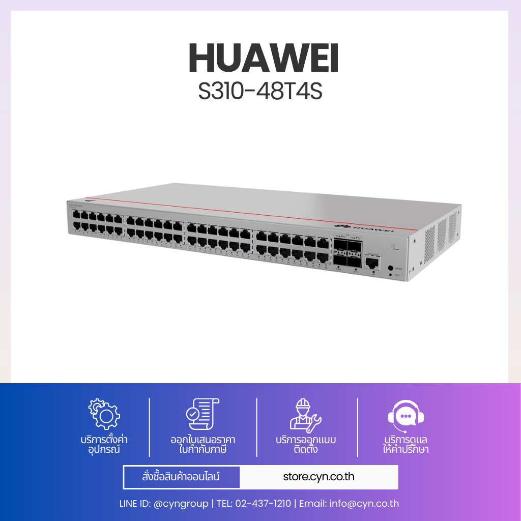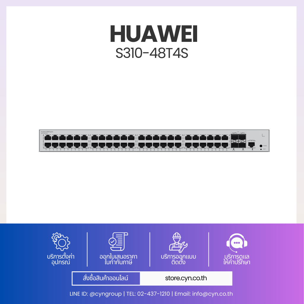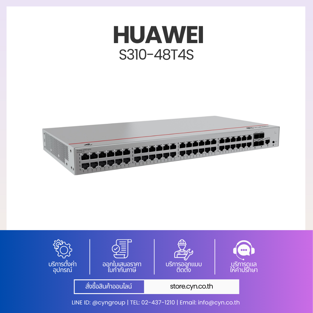 Huawei eKitEngine S310-48T4S เป็นสวิตช์ Layer 2+ (รองรับ Static Route) ที่ออกแบบมาสำหรับงาน Access Layer ในองค์กรและธุรกิจขนาดเล็กถึงกลาง รองรับอุปกรณ์ปลายทางจำนวนมากด้วย 48 x Gigabit Ethernet Ports และมี 4 x GE SFP สำหรับเชื่อมต่อ Uplink ไปยัง Core หรือ Aggregation Switch