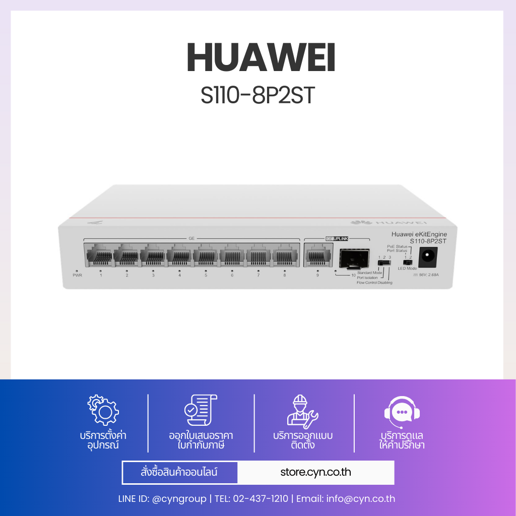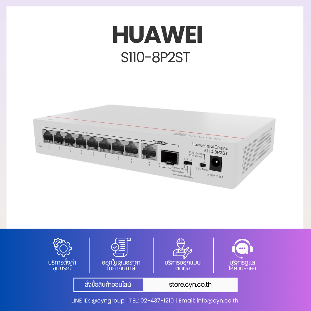 Huawei eKitEngine S110-8P2ST เป็น Unmanaged Switch ที่ออกแบบมาสำหรับงาน Access Layer ในธุรกิจขนาดเล็ก (SOHO), ร้านค้า และสำนักงานขนาดย่อม รองรับ 8 x Gigabit Ethernet แบบ PoE+ สำหรับจ่ายไฟให้ Access Point, IP Camera และอุปกรณ์ปลายทางอื่น ๆ ได้โดยตรง พร้อม Uplink 1 x GE RJ45 และ 1 x GE SFP เพิ่มความยืดหยุ่นในการเชื่อมต่อเครือข่าย