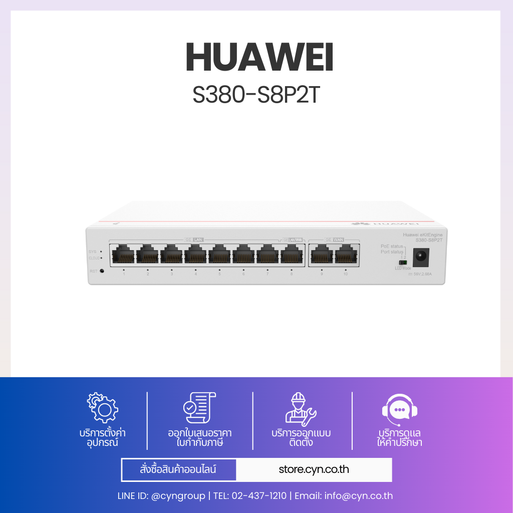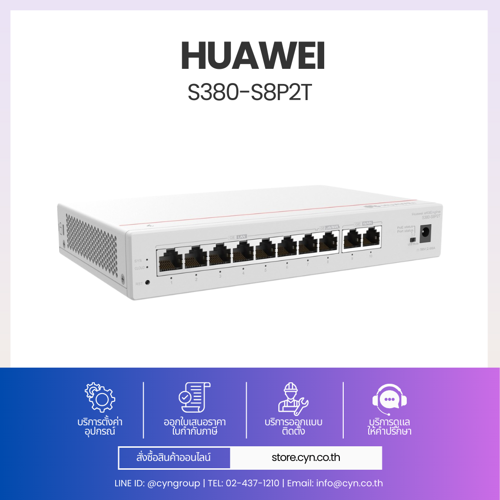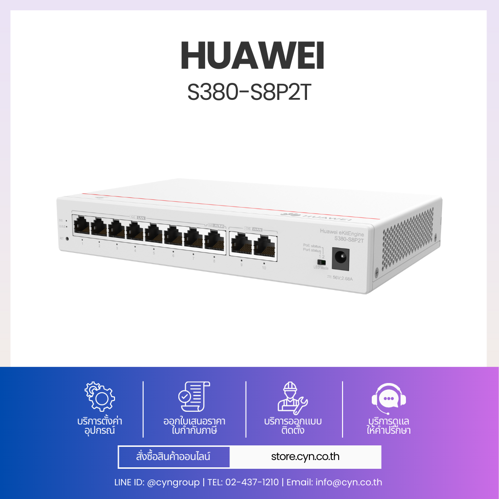 Huawei eKit S380-S8P2T เป็น Enterprise Router ที่ออกแบบมาสำหรับธุรกิจขนาดกลางและองค์กรที่มีผู้ใช้งานจำนวนมาก รองรับการเชื่อมต่ออินเทอร์เน็ตแบบ Dual WAN (2 x GE WAN) เพื่อเพิ่มความเสถียรและรองรับการใช้งานต่อเนื่อง