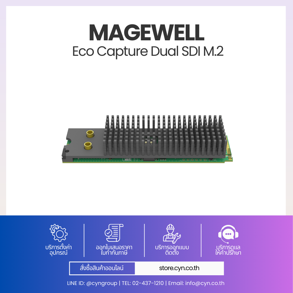 Magewell Eco Capture Dual SDI M.2 คือการ์ด Capture แบบ M.2 สำหรับจับสัญญาณ SDI พร้อมกัน 2 ช่อง รองรับ SD/HD/3G-SDI ให้คุณภาพระดับมืออาชีพ ใช้พลังงานต่ำ ขนาดกะทัดรัด เหมาะสำหรับ Embedded System, Industrial PC และระบบ Video Processing แบบฝังตัว