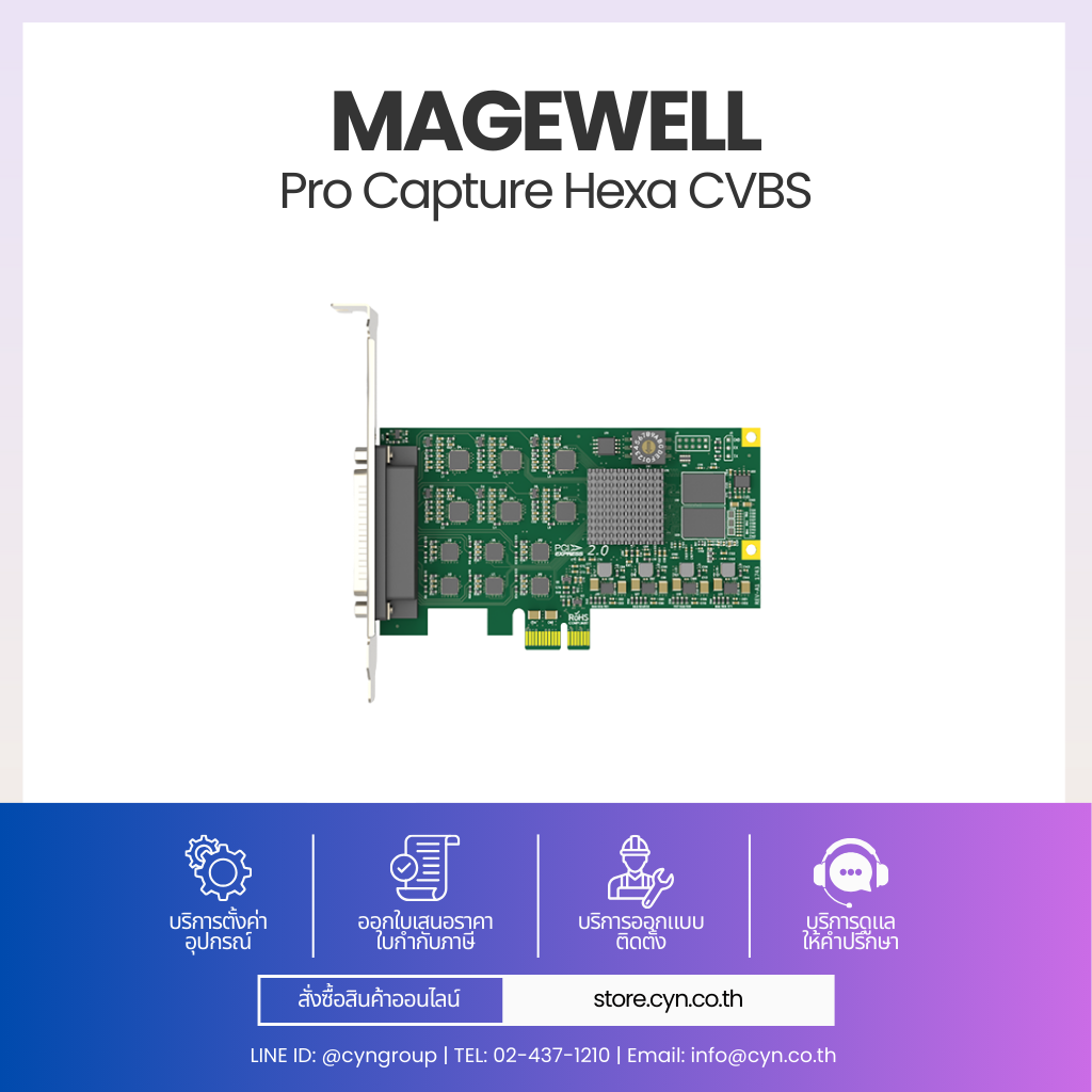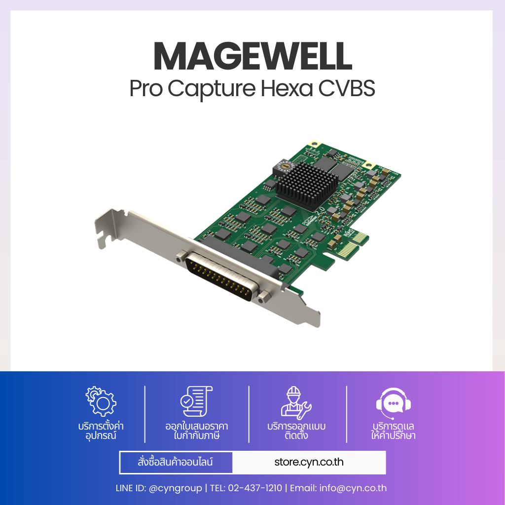 Magewell Pro Capture Hexa CVBS ถูกออกแบบมาสำหรับการใช้งานกับระบบวิดีโออนาล็อกโดยเฉพาะ รองรับ Composite Video (CVBS) จำนวน 6 ช่อง ผ่านพอร์ต DB25 พร้อมสาย Breakout สำหรับ Composite Video และเสียง Analog (L/R) แยกแต่ละช่อง
