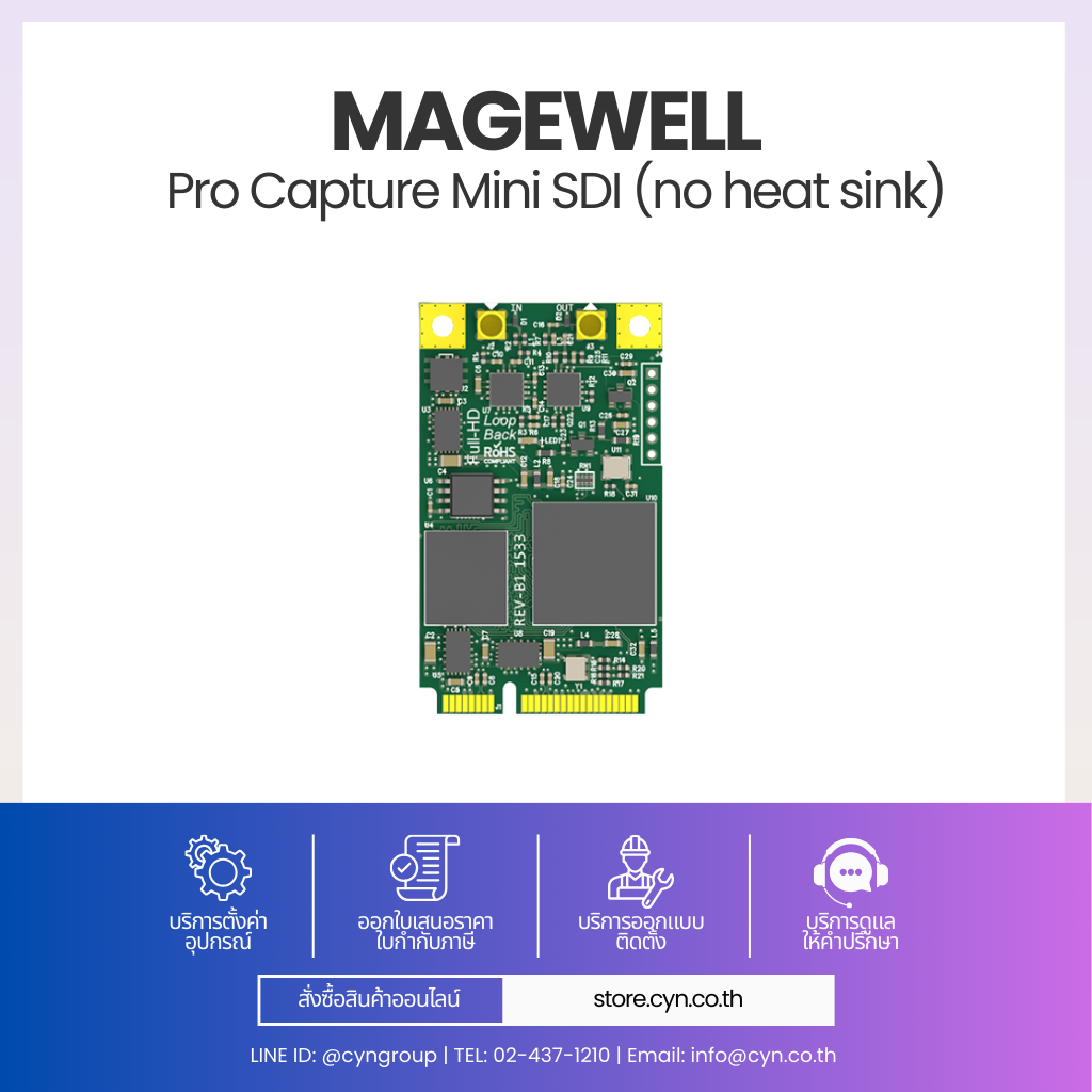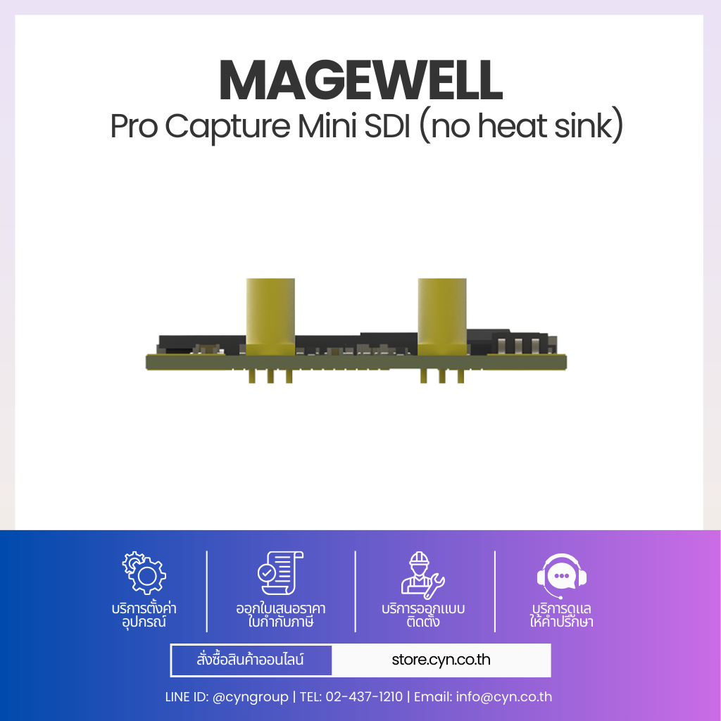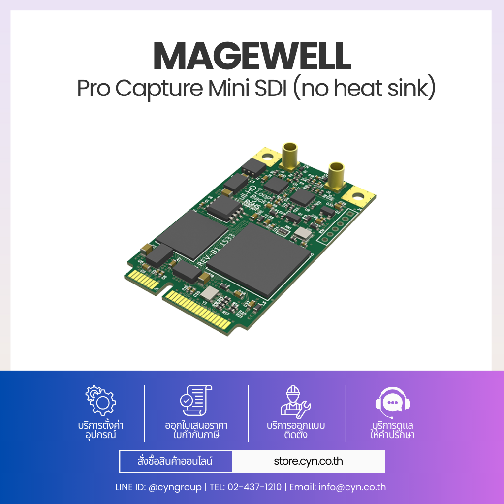 Magewell Pro Capture Mini SDI (No Heat Sink) คือการ์ด Capture แบบ Mini PCIe สำหรับจับสัญญาณ SD/HD/3G-SDI คุณภาพระดับ Broadcast รองรับความละเอียดสูงสุด 2048×1080 พร้อม Latency ต่ำมาก ออกแบบมาโดยไม่มี Heat Sink เพื่อรองรับอุปกรณ์ที่มีระบบระบายความร้อนภายในอยู่แล้ว