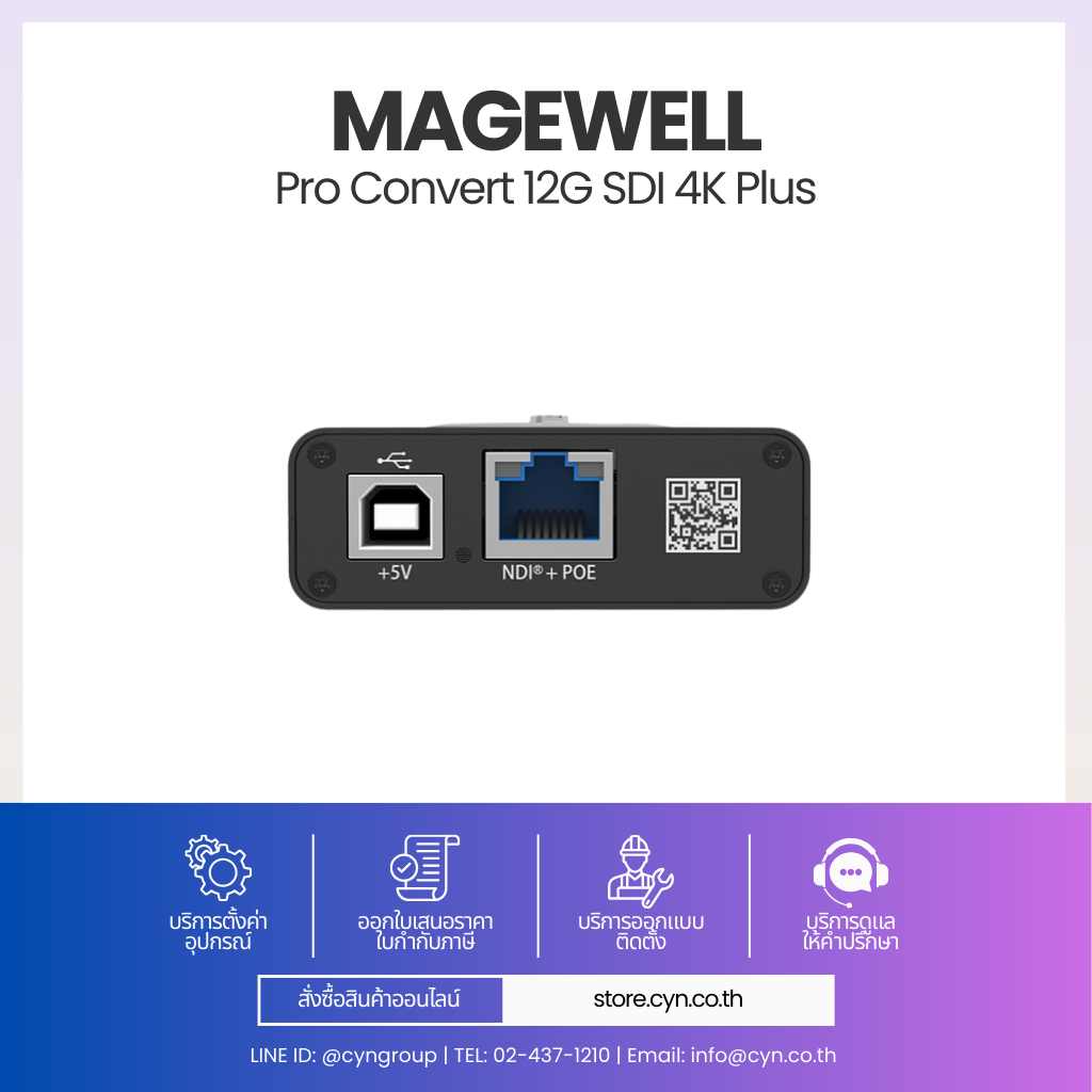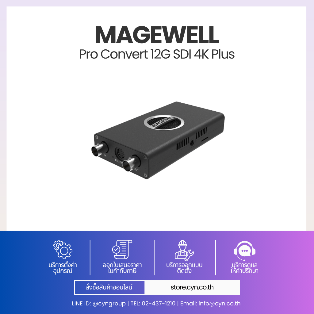 Magewell Pro Convert 12G SDI 4K Plus คืออุปกรณ์ Video Converter แบบ Standalone สำหรับแปลงสัญญาณ 12G-SDI 4K เป็น IP Video และ NDI® รองรับความละเอียดสูงสุด 4096×2160 @60fps ให้คุณภาพระดับ Broadcast เหมาะสำหรับ Live Production, Control Room และระบบ AV over IP โดยไม่ต้องใช้คอมพิวเตอร์