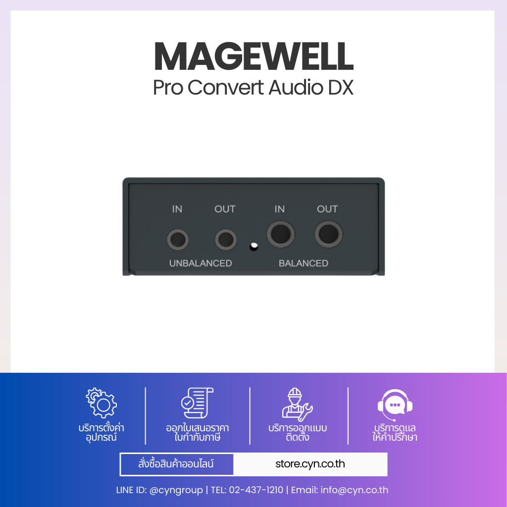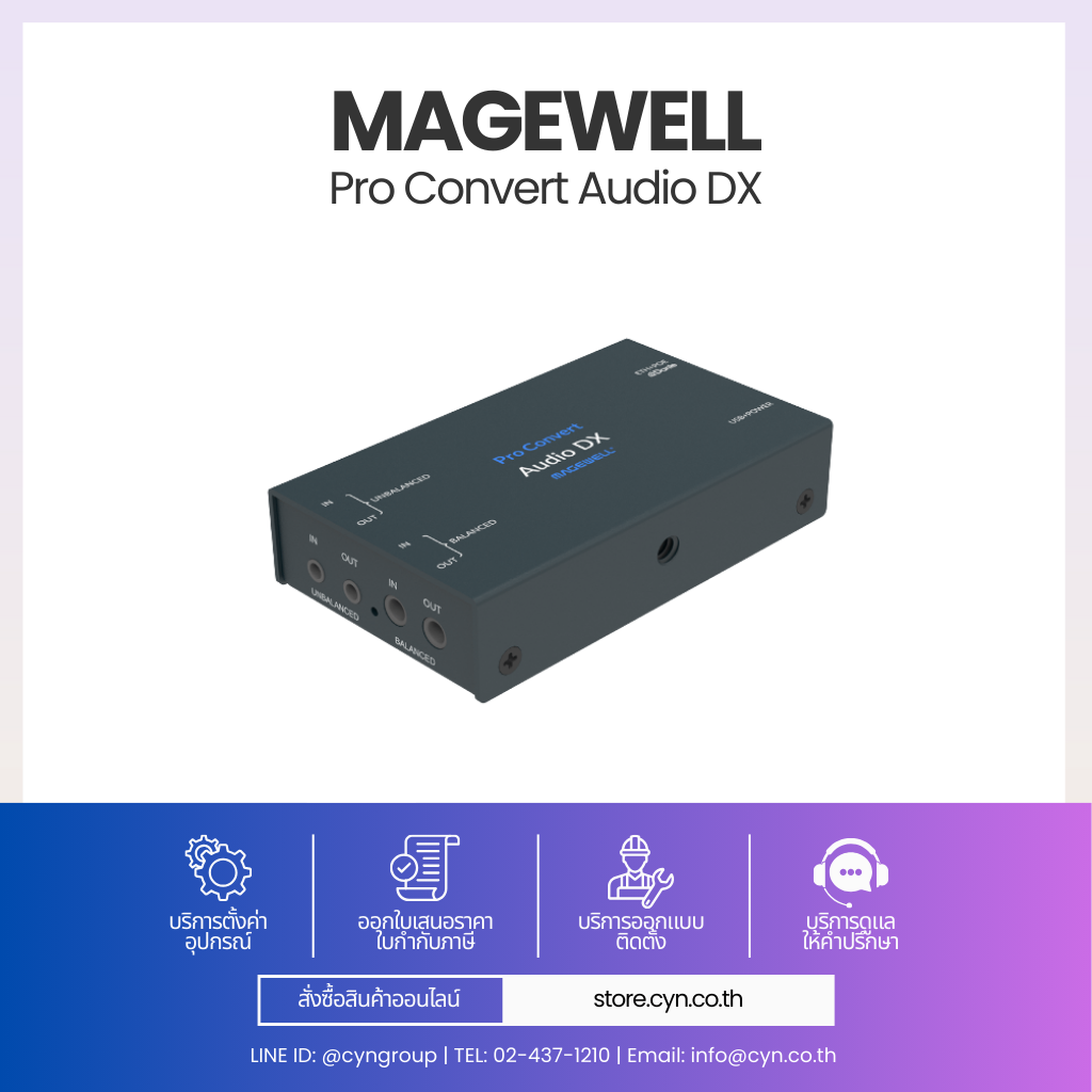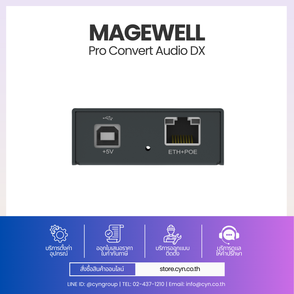 Magewell Pro Convert Audio DX คืออุปกรณ์ Audio Converter แบบ Standalone สำหรับแปลงสัญญาณเสียง Analog และ Digital Audio ให้เป็น IP Audio มาตรฐาน AES67 ใช้งานได้กับระบบ Broadcast และ AV over IP อย่างเสถียร เหมาะสำหรับงาน Live, Studio และระบบเสียงระดับองค์กร