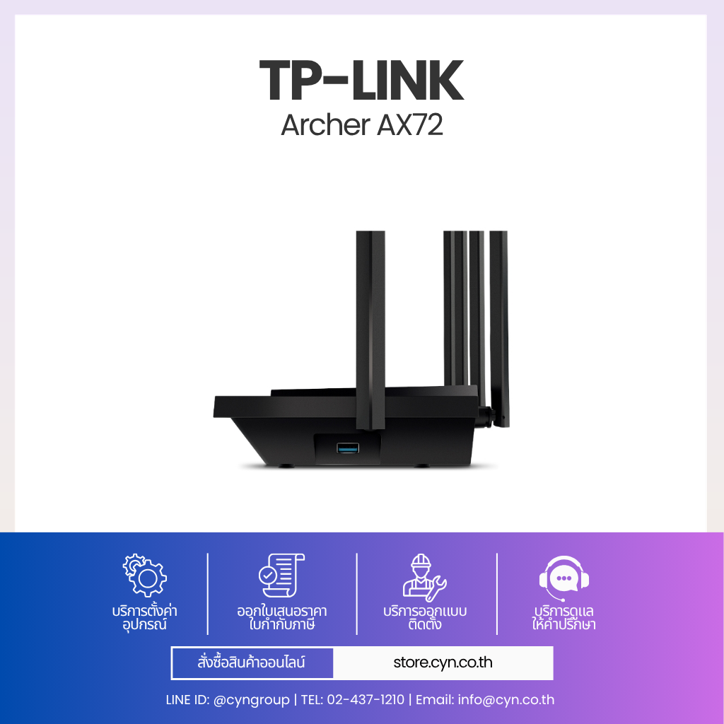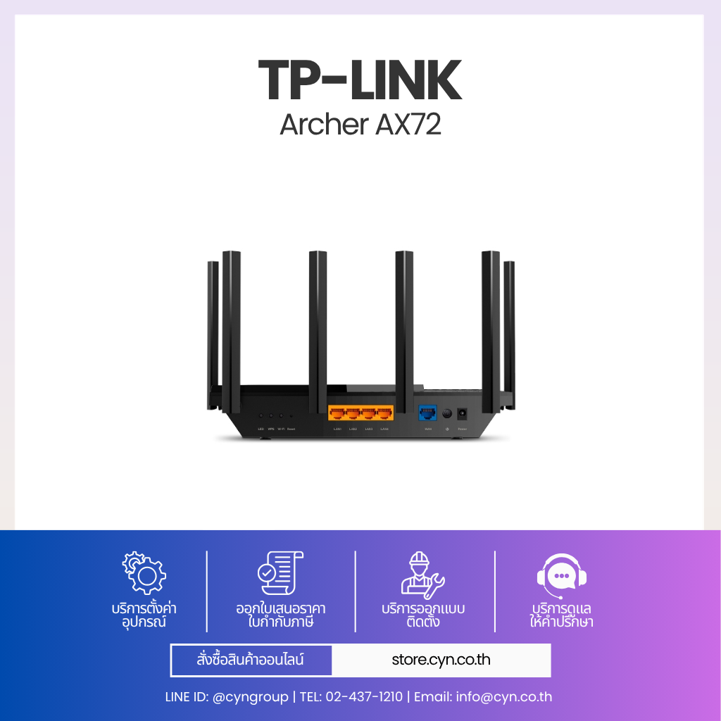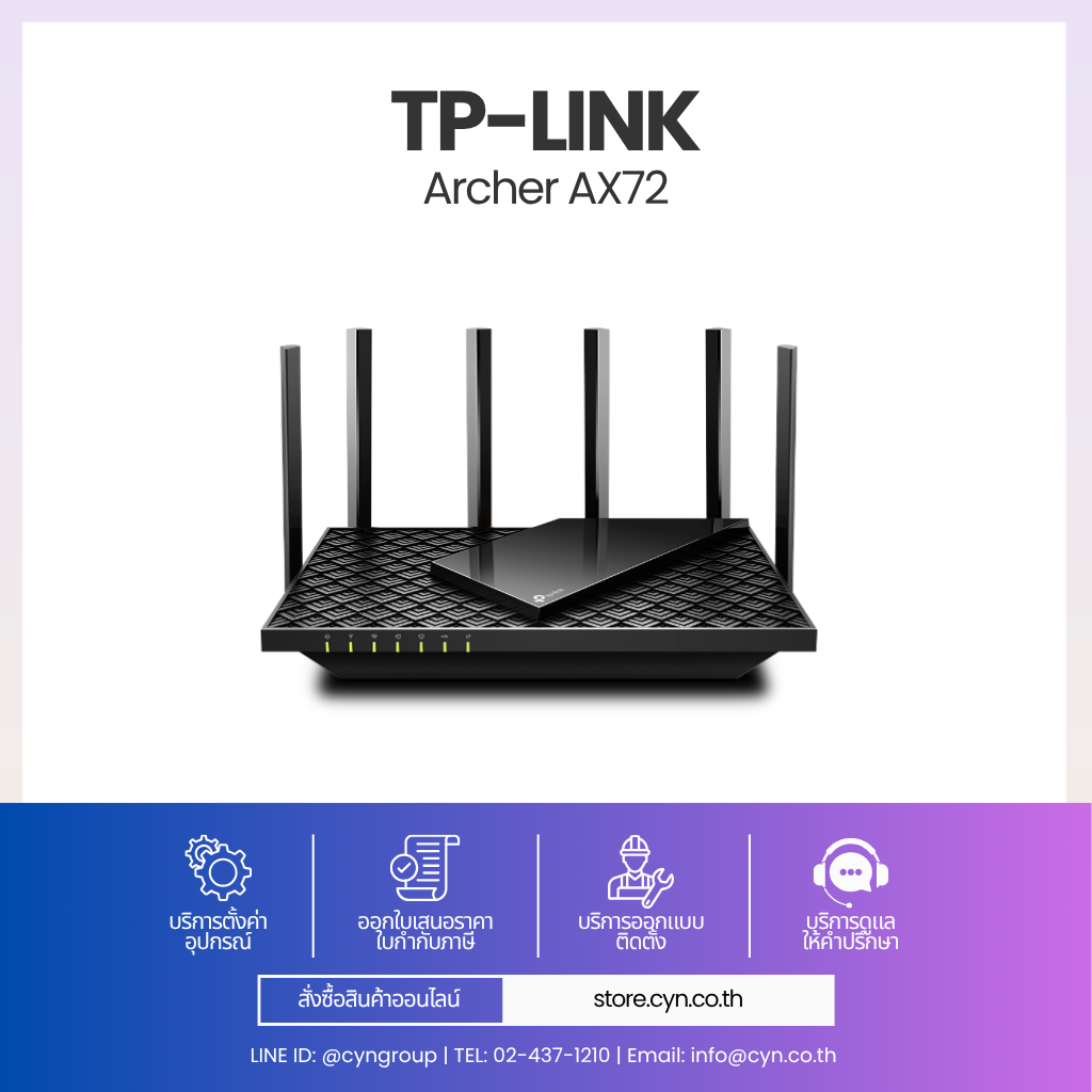 TP-Link Archer AX72 เป็นเราเตอร์มาตรฐาน Wi-Fi 6 (802.11ax) แบบ Dual-Band 6-Stream ให้ความเร็วรวมสูงสุด 5400 Mbps (4804 Mbps @5GHz + 574 Mbps @2.4GHz) รองรับ HT160 และ 1024-QAM เพื่อเพิ่มประสิทธิภาพการรับส่งข้อมูล