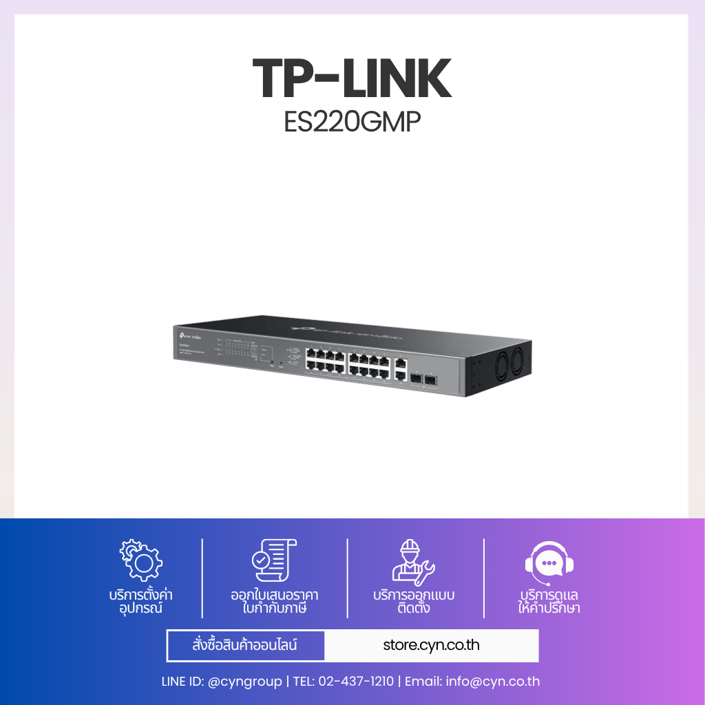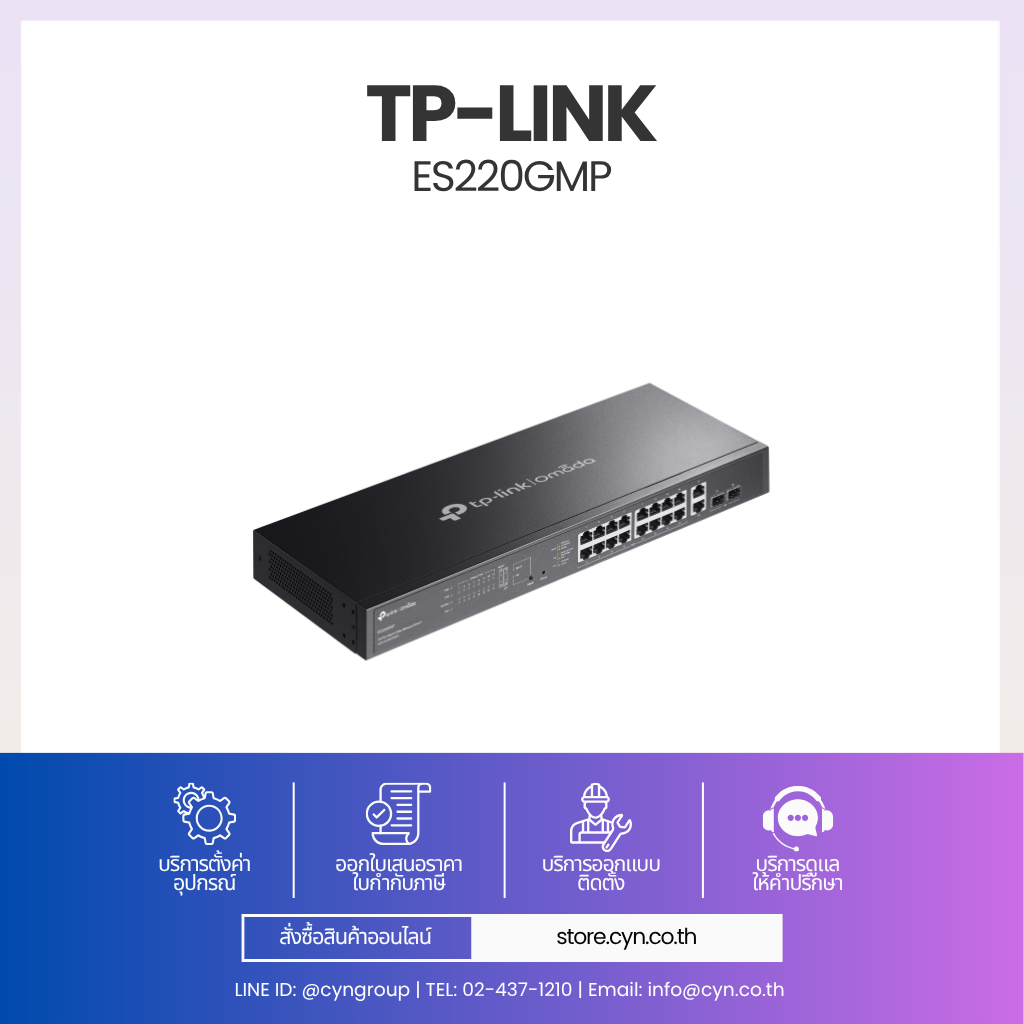 TP-Link ES220GMP รองรับ 16 พอร์ต Gigabit PoE+ (802.3af/at) พร้อม 2 พอร์ต Gigabit RJ45 และ 2 พอร์ต Gigabit SFP สำหรับ Uplink