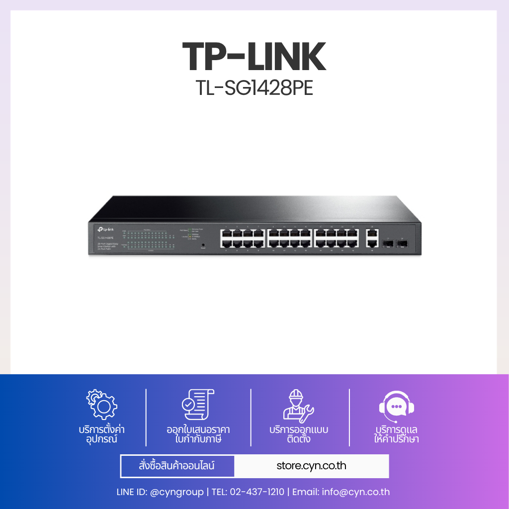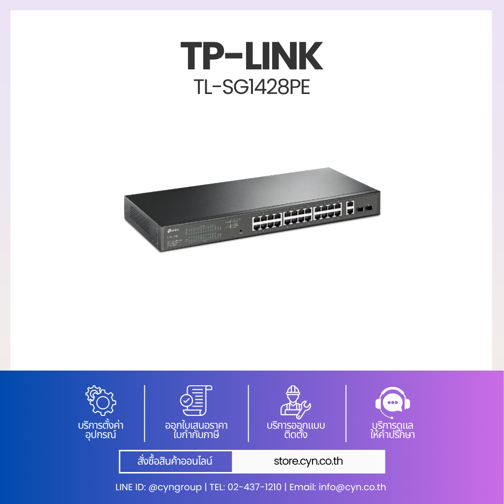 TP-Link TL-SG1428PE มาพร้อม 24 พอร์ต Gigabit PoE+ และ 2 ช่อง SFP สำหรับ Uplink ไฟเบอร์ รองรับมาตรฐาน 802.3af/at จ่ายไฟสูงสุด 30W ต่อพอร์ต และ PoE Budget รวม 250W