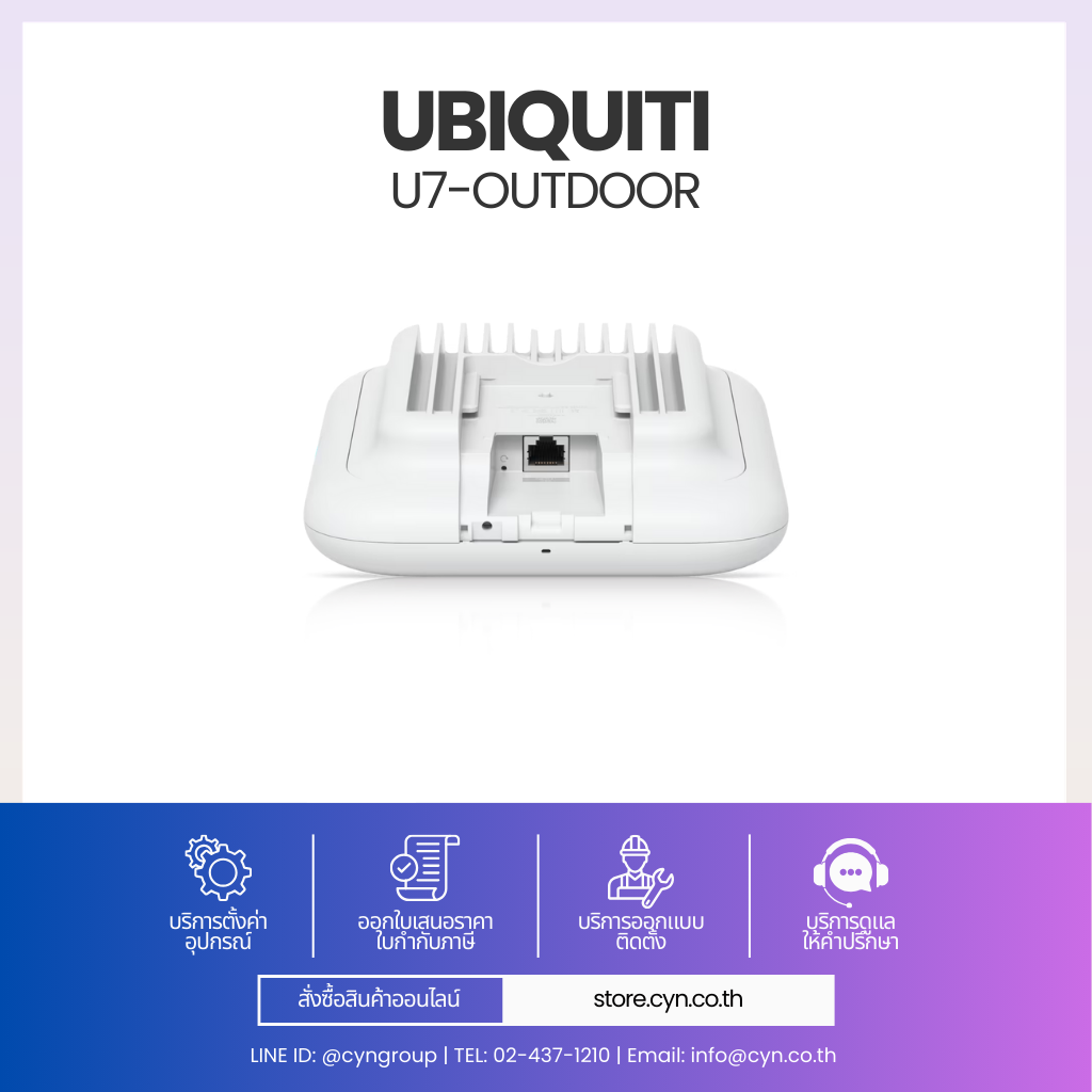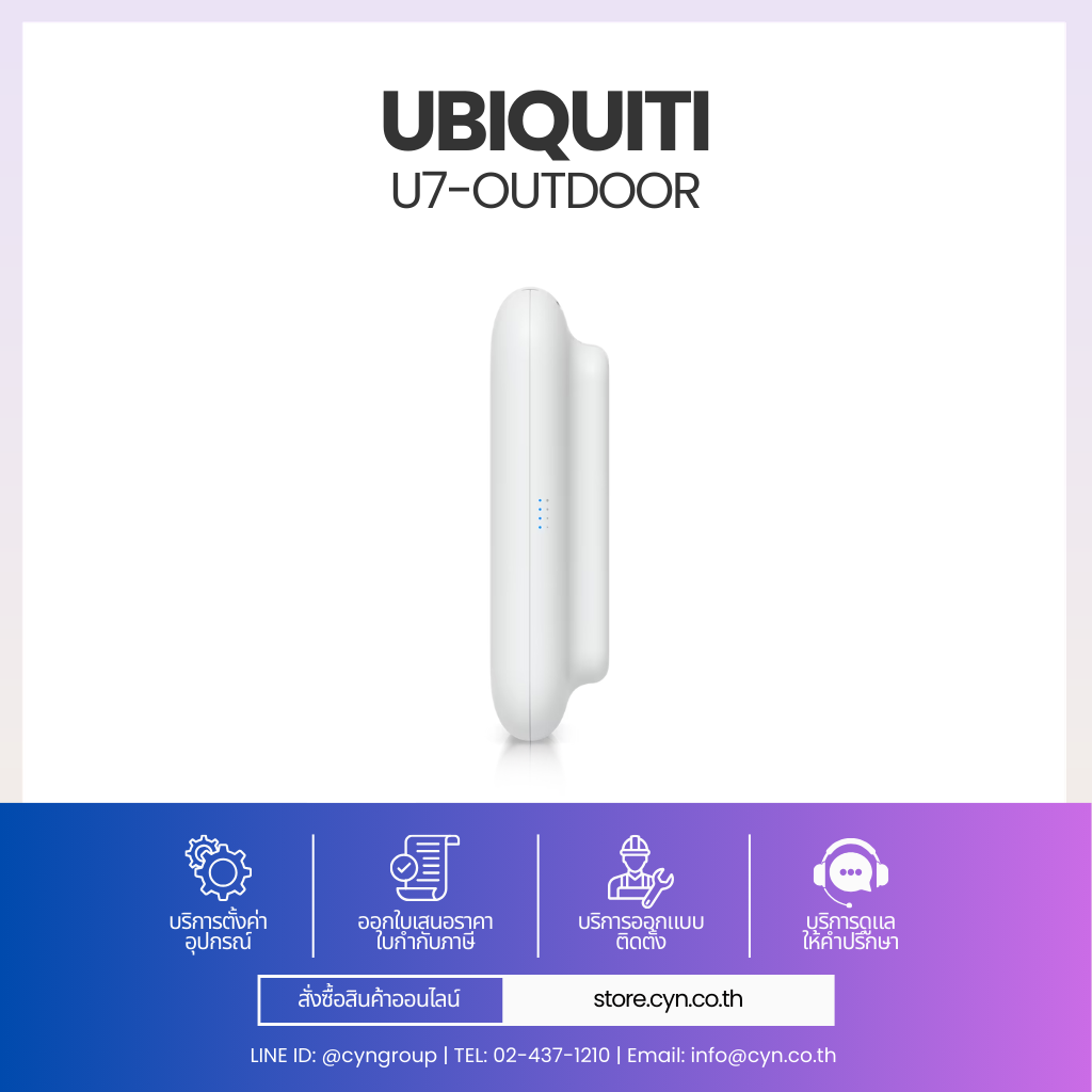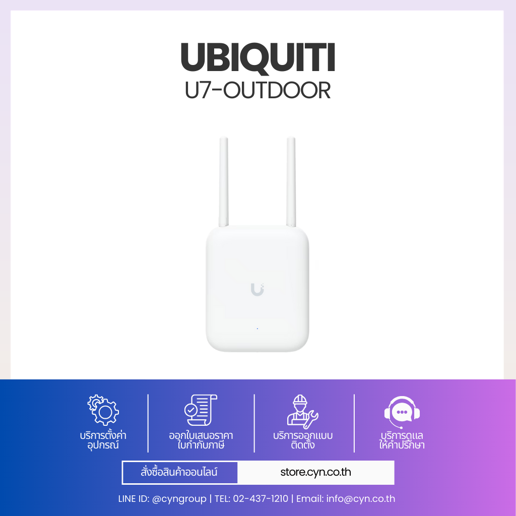 Ubiquiti U7-Outdoor คือ Access Point สำหรับติดตั้งภายนอกอาคารที่รองรับเทคโนโลยี Wi-Fi 7 ให้ความเร็วและความเสถียรสูง รองรับการเชื่อมต่อพร้อมกันมากกว่า 200 อุปกรณ์ มาพร้อมเสาอากาศแบบ Directional ในตัว และรองรับการติดตั้งเสาอากาศภายนอกเพิ่มเติมผ่าน RP-SMA
